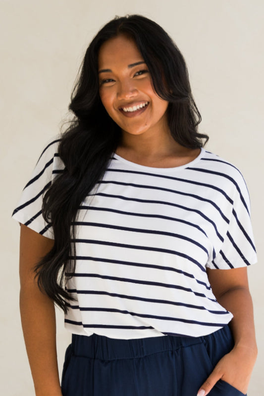 DESTINY Bamboo Short Sleeve Classic Length Top | White/Navy Stripe