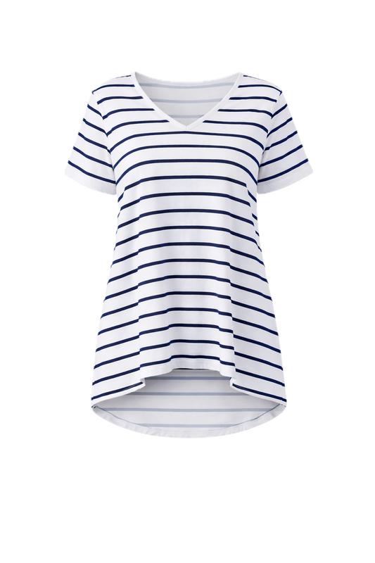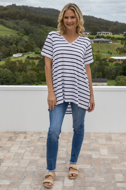 T-SHIRT Bamboo Short Sleeve Hi Lo Classic Length Top | White/Navy Stripe