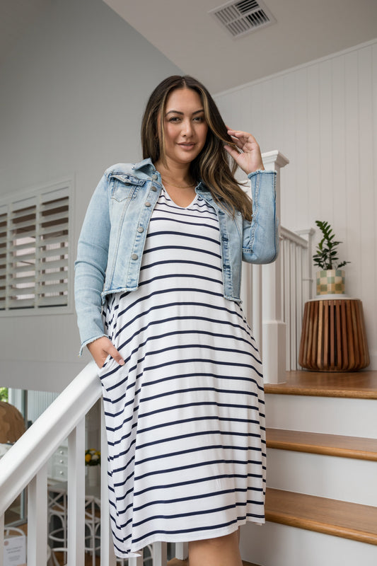 T-SHIRT Bamboo Short Sleeve Classic/Midi Dress | White/Navy Stripe