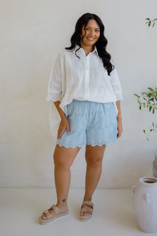 FLEUR Cotton Anglaise Classic Length Shorts | Powder Blue | FINAL SALE