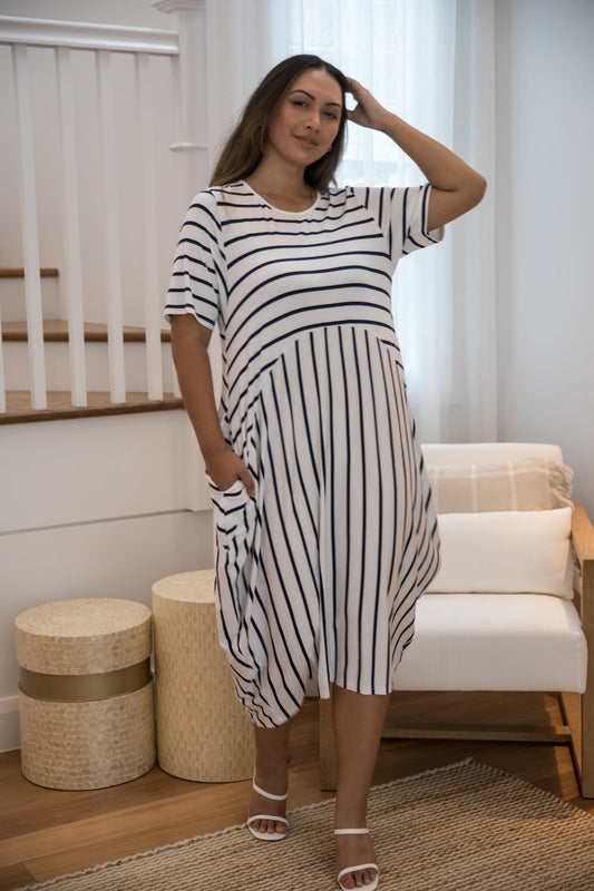 SOHO Bamboo Short Sleeve Midi Dress | White/Navy Stripe