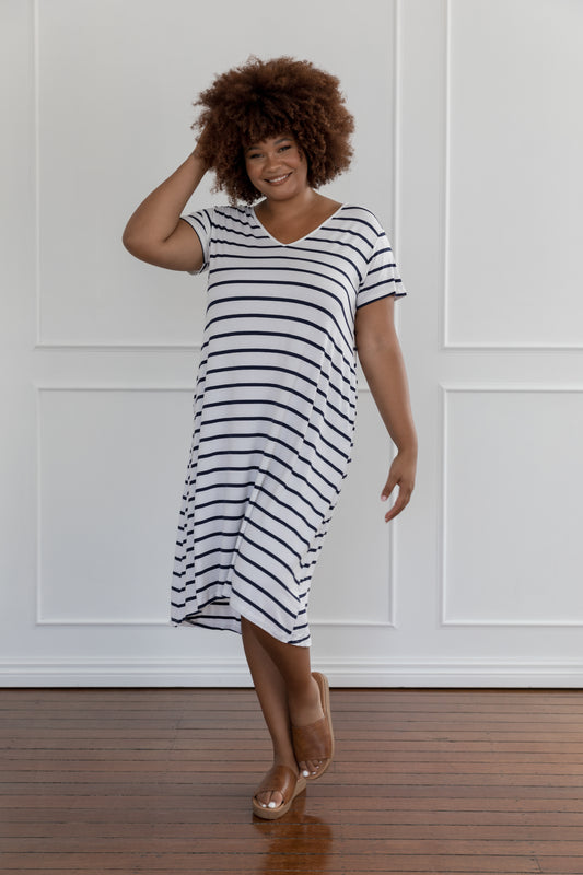 T-SHIRT Bamboo Short Sleeve Classic/Midi Dress | White/Navy Stripe