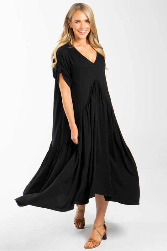 PEAK Rayon Short Sleeve Hi Lo Maxi Dress | Black