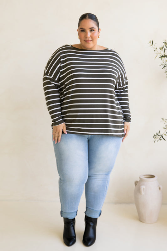 PIPPA Bamboo Long Sleeve Classic Length Top | Moss Green/White Stripe