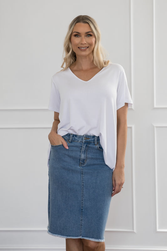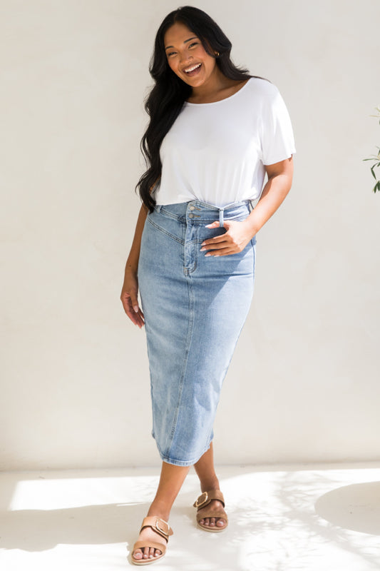 FRAY Denim Classic Length Skirt | Light Denim | FINAL SALE