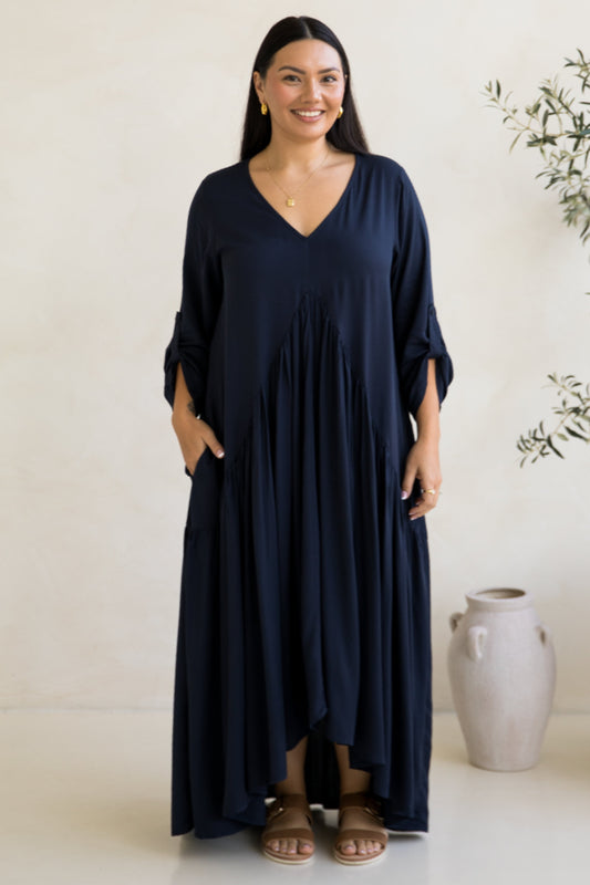 PEAK Rayon Long Sleeve Hi Lo Maxi Dress | Navy