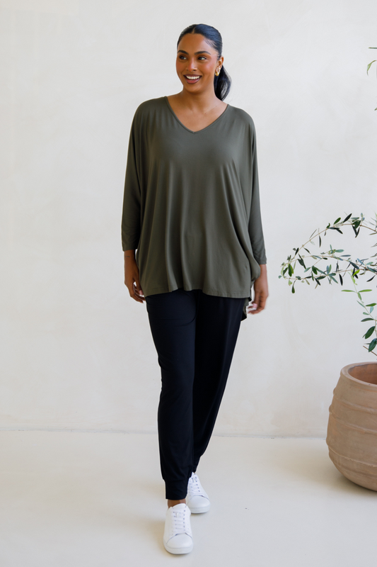 ESSENTIAL Bamboo Demi Sleeve Hi Lo Classic Length Top | Moss Green