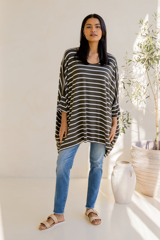 ESSENTIAL Bamboo Demi Sleeve Hi Lo Classic Length Top | Moss Green/White Stripe