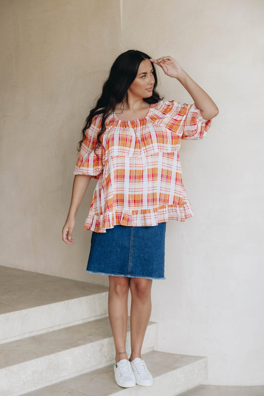 EFLIE Rayon Long Sleeve Longline Ruffle Top | Ember Check | FINAL SALE