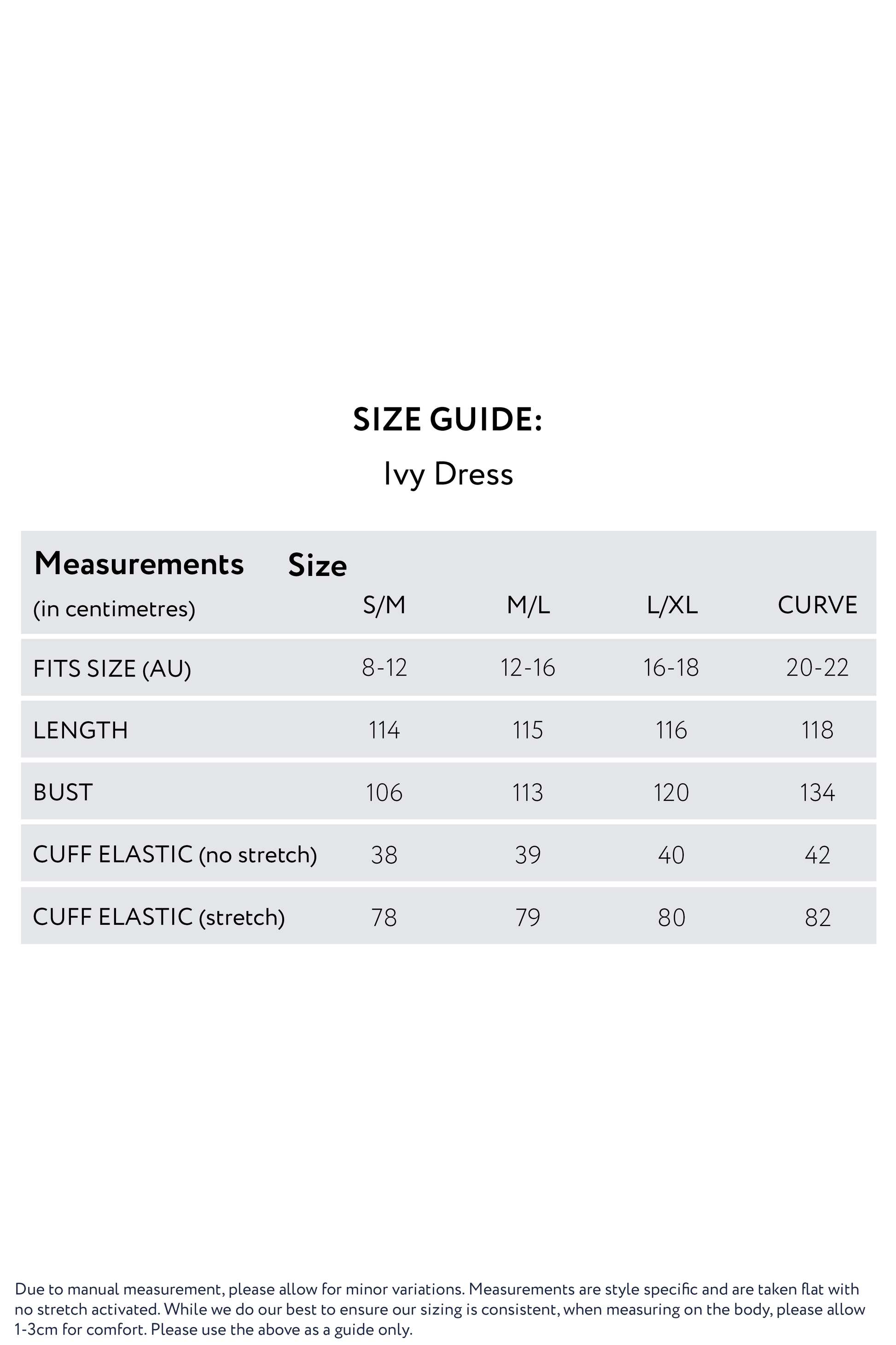 • We recommend choosing your size for the Ivy Dress based on the bust measurements for your body