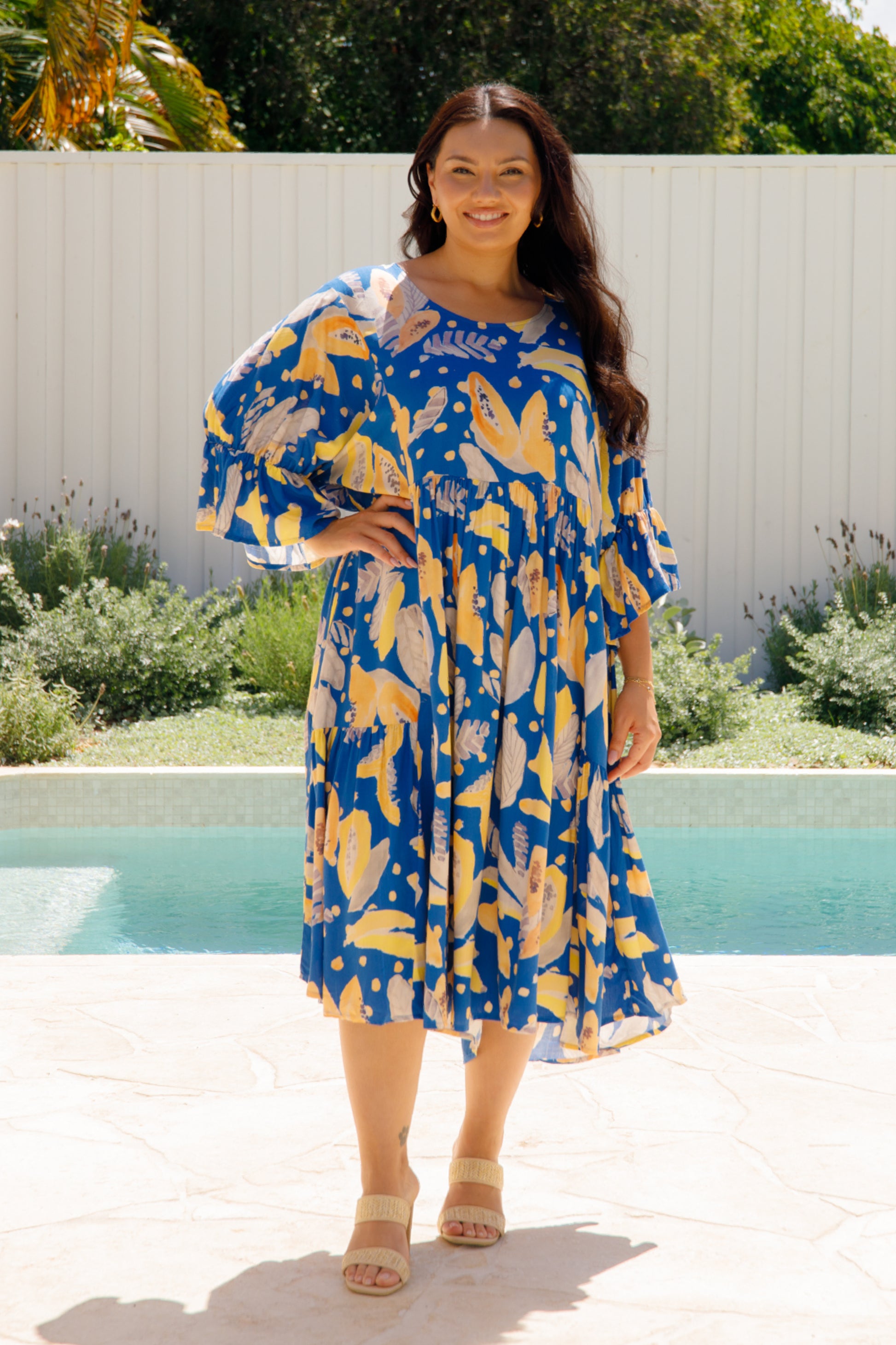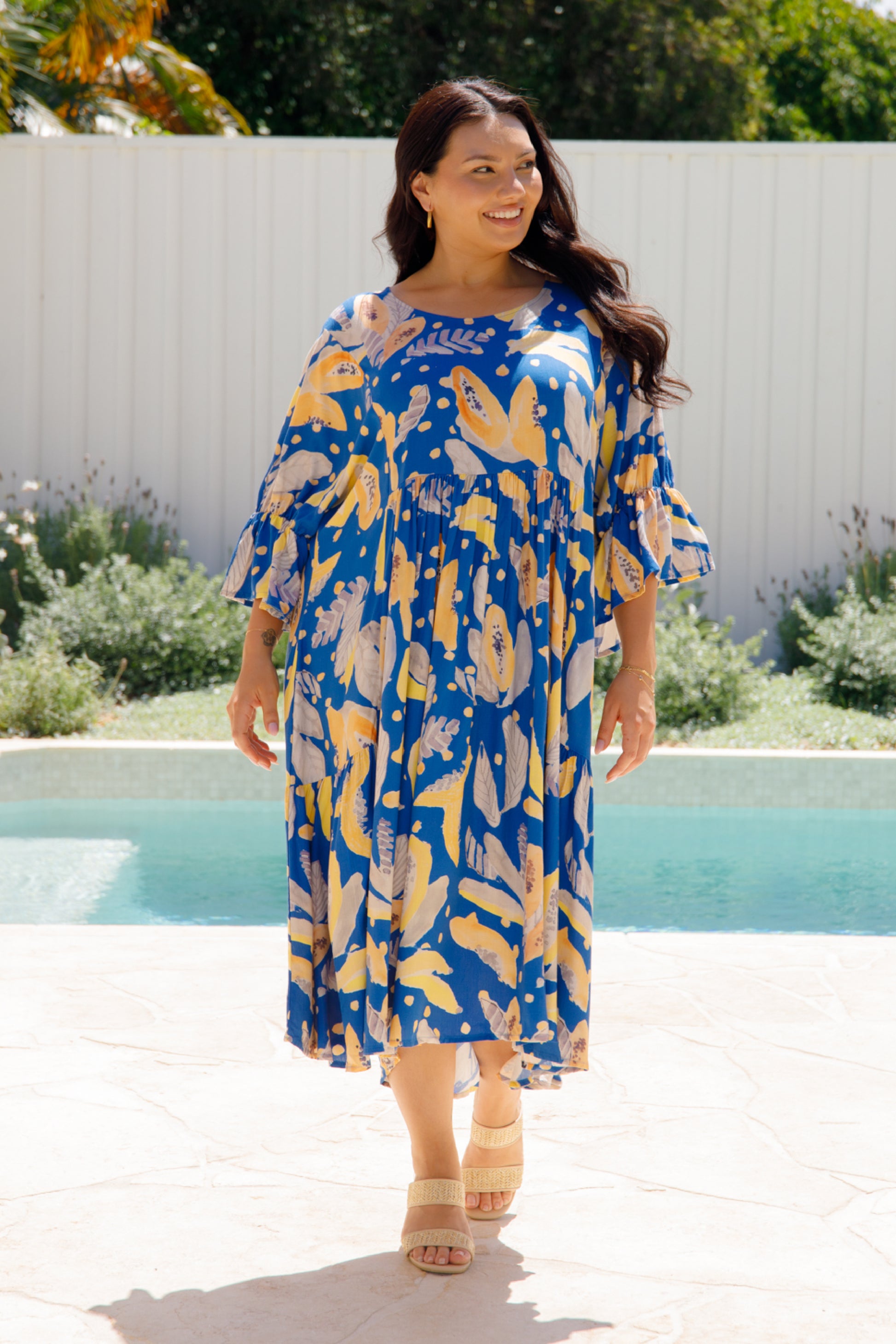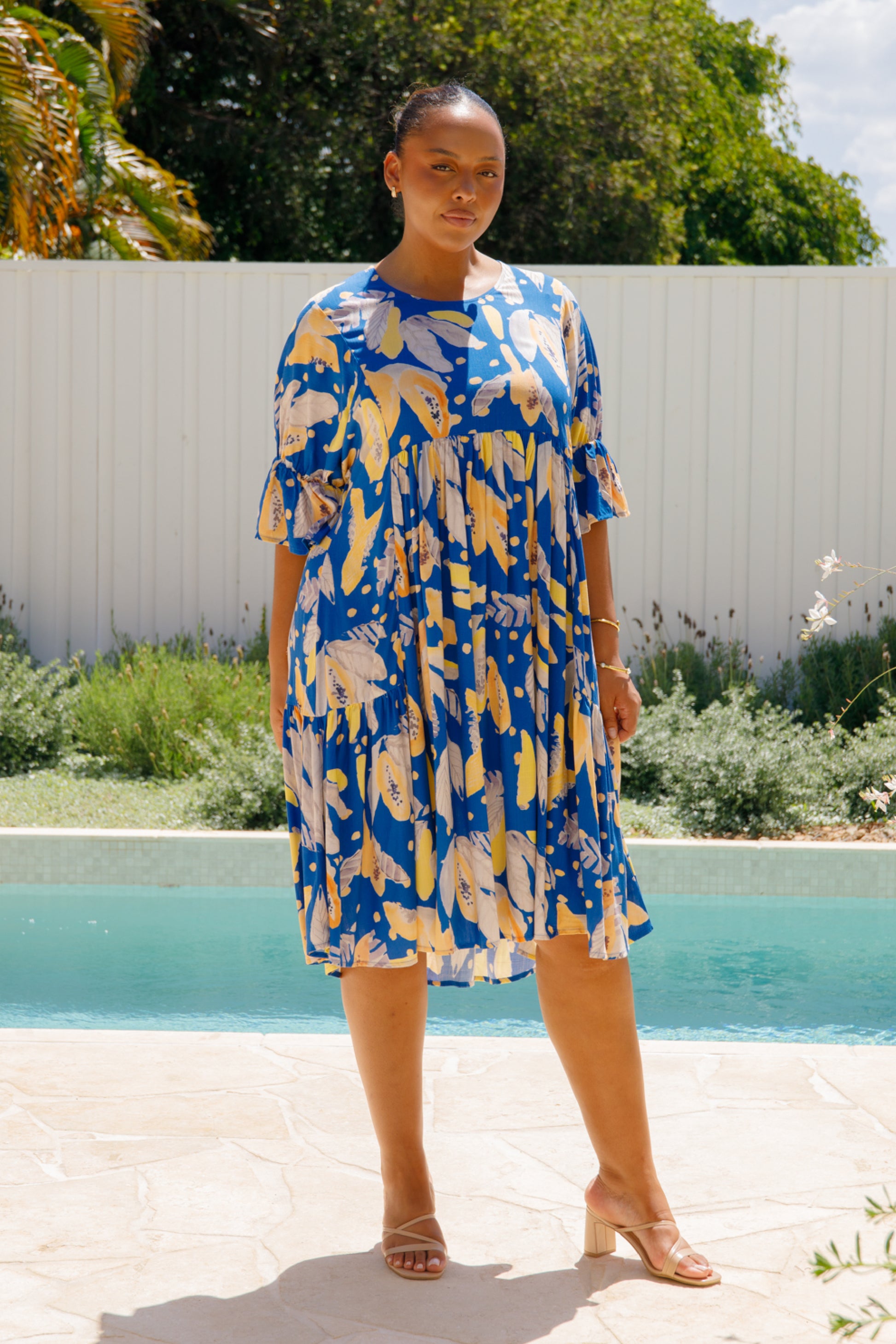 The Ivy Dress is crafted from ultra-soft 100% rayon, featuring a midi-length tiered skirt and a scoop neckline. It includes an internal drawstring for a flattering fit and 3/4 length flutter sleeves for added style.