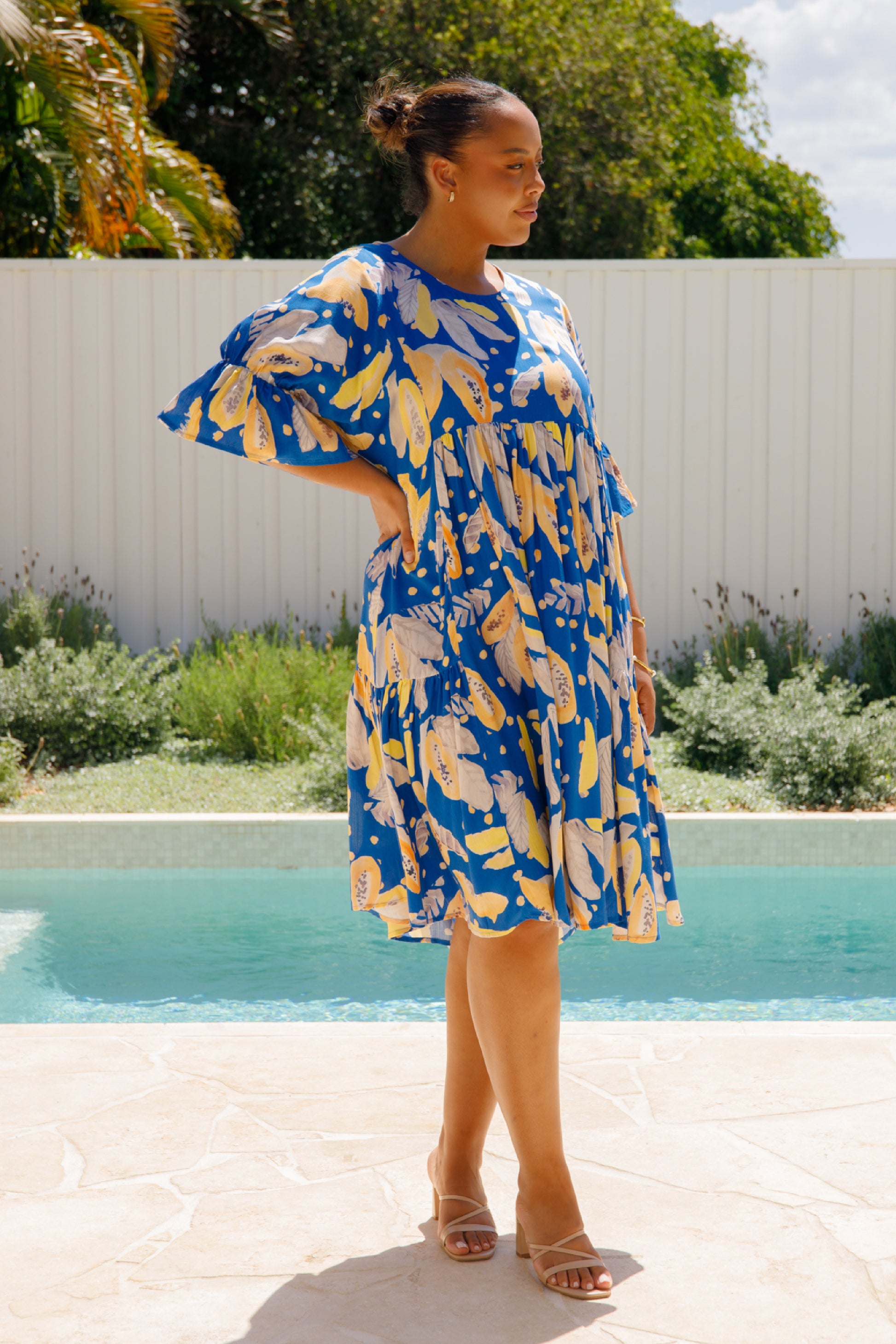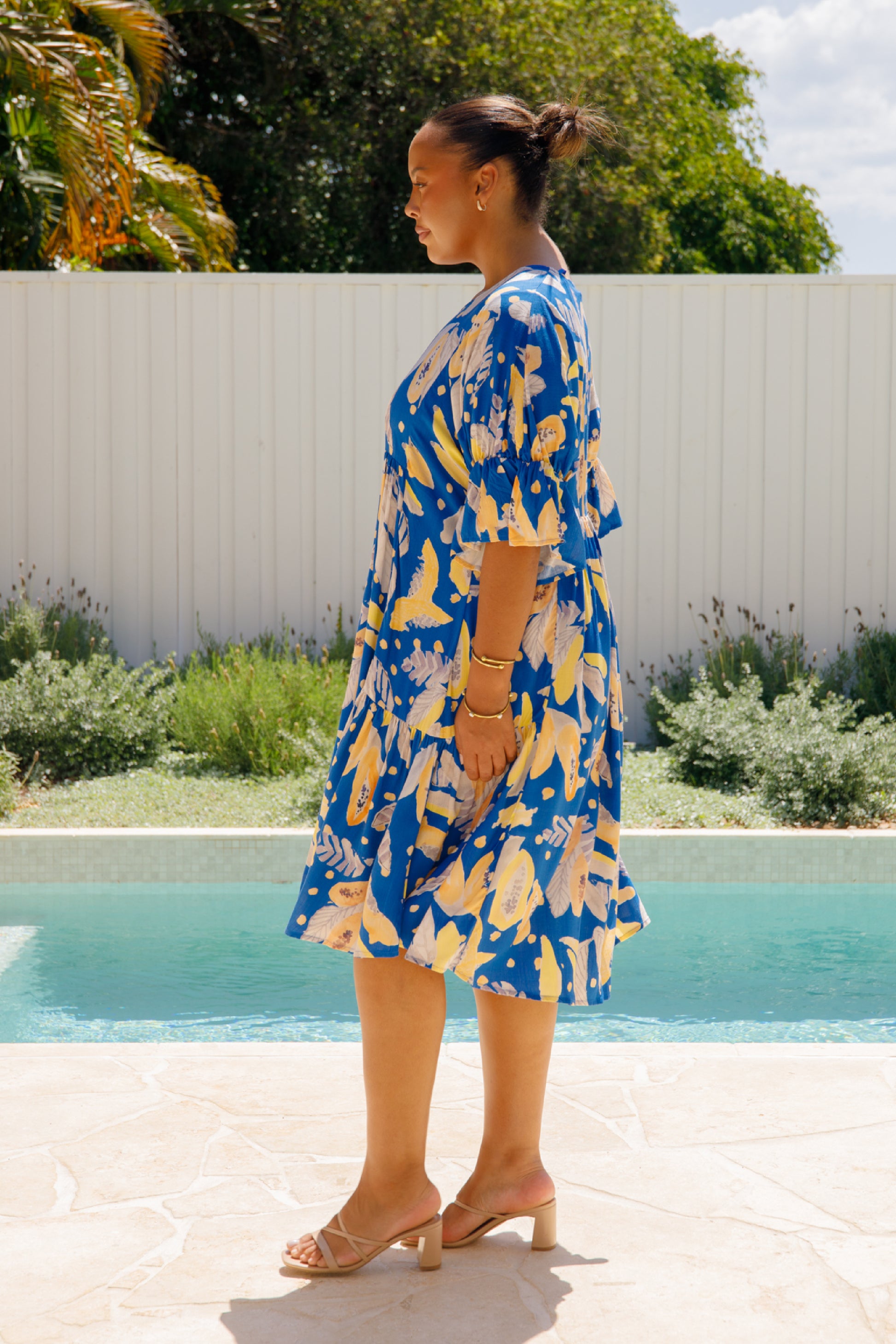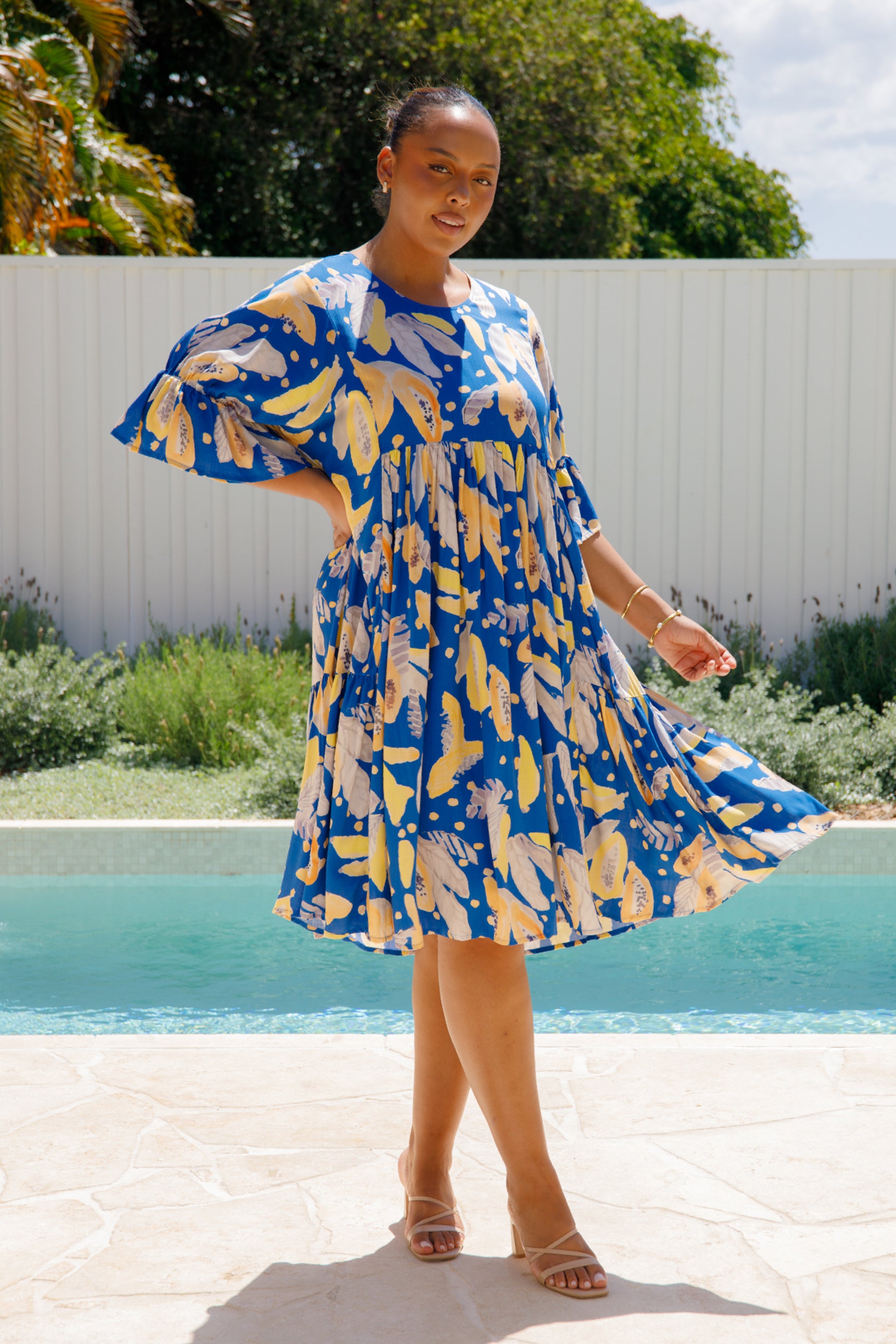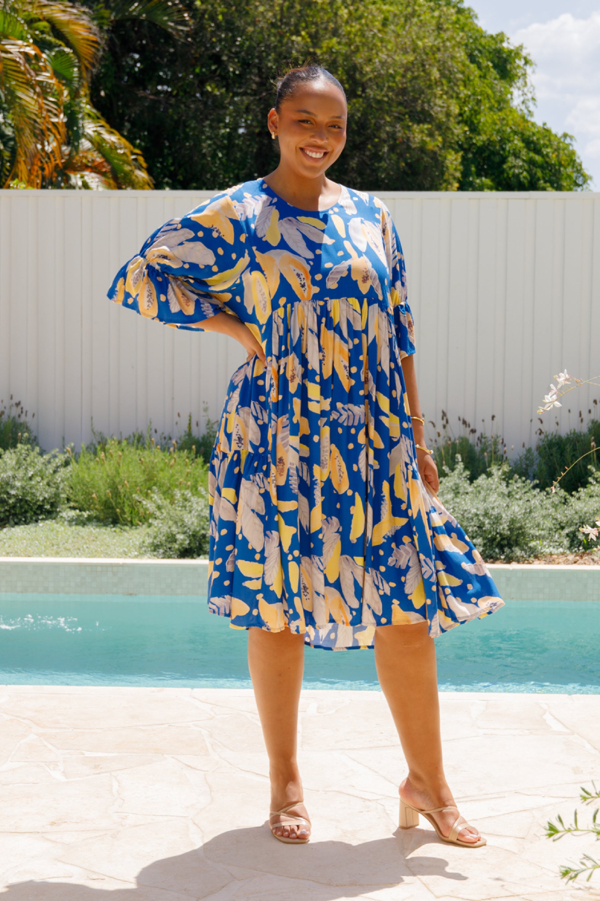 The Ivy Dress is crafted from ultra-soft 100% rayon, featuring a midi-length tiered skirt and a scoop neckline. It includes an internal drawstring for a flattering fit and 3/4 length flutter sleeves for added style.