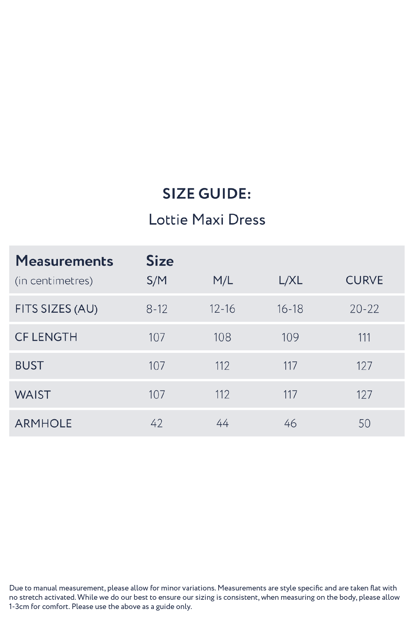• We recommend choosing your size for the Lottie Dress based on the bust measurements for your body