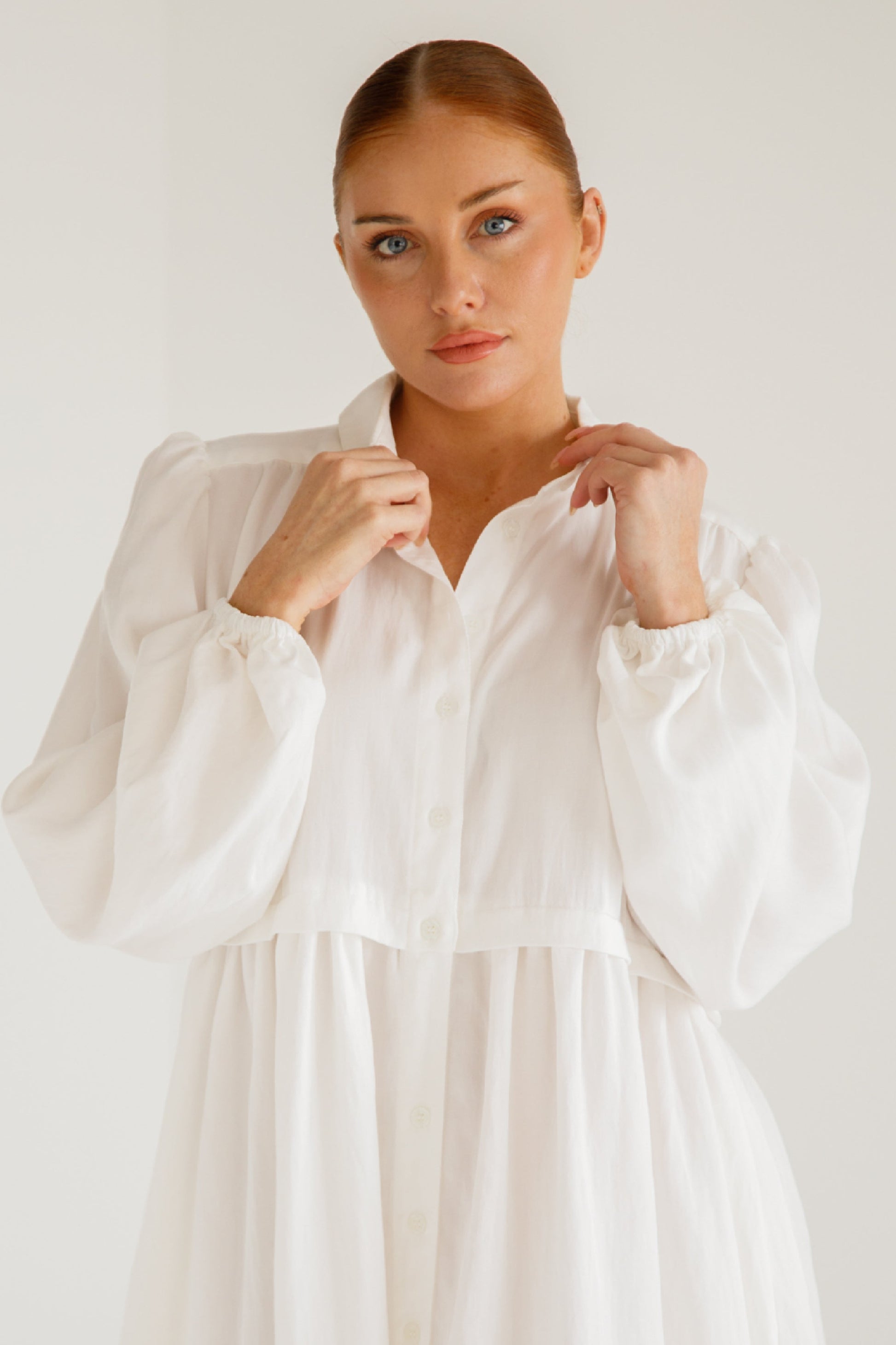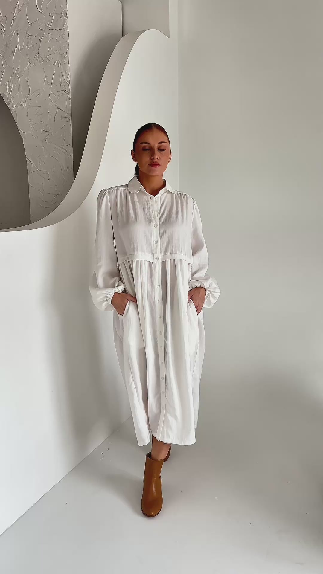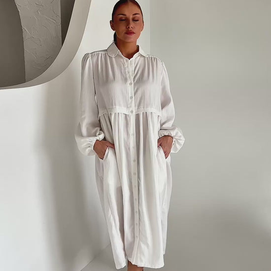 The Lyla Dress is a shirt-style midi dress featuring a rounded collar and functional front buttons. Designed with a yoked centre back and shoulders, it offers a structured yet effortless fit. Balloon sleeves with elasticated cuffs add subtle volume, while the gathered skirt and in-seam hip pockets provide comfort and practicality. crafted from a lightweight blend of Tencel, Viscose, and Nylon for a comfortable fit.