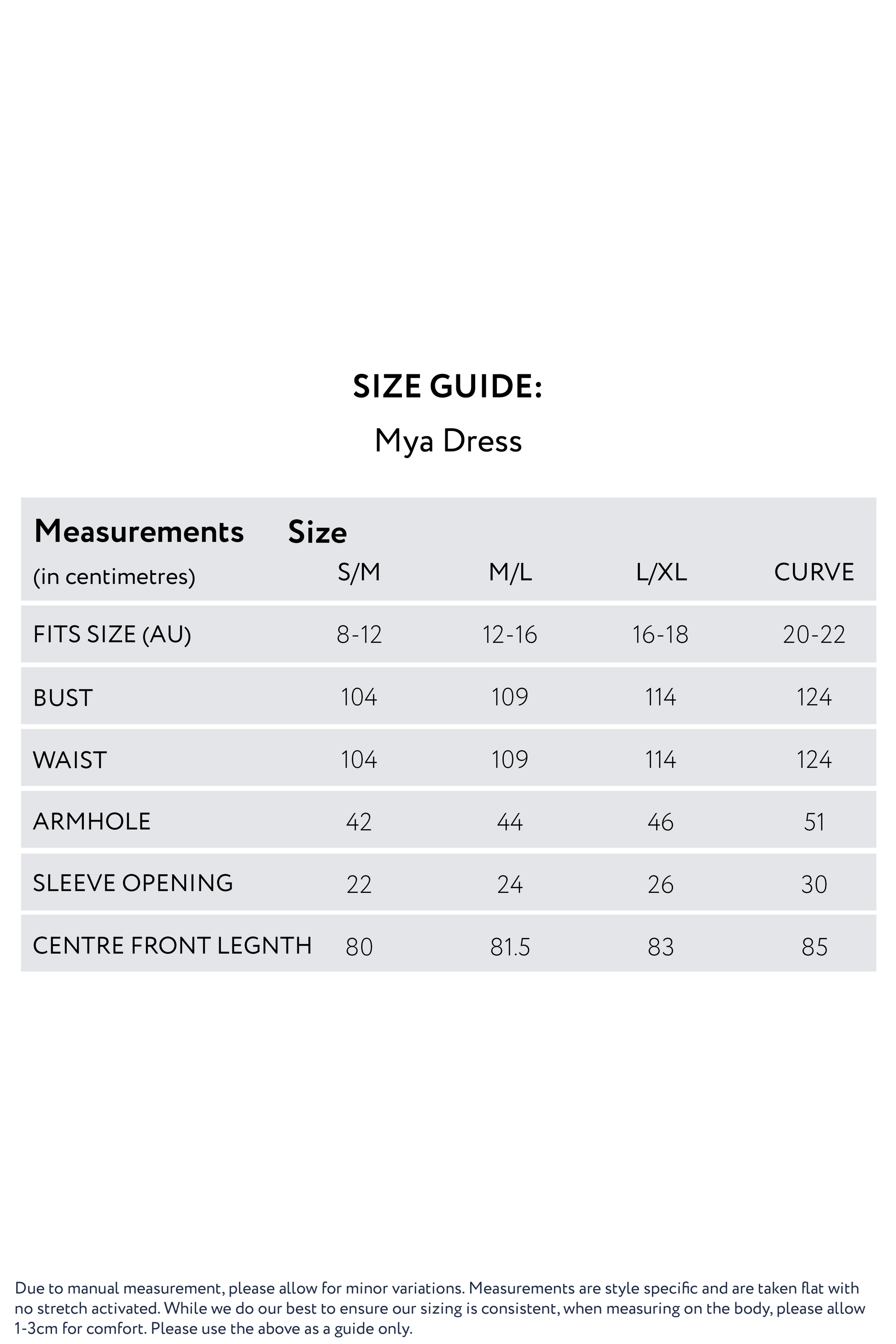 • We recommend choosing your size for the Mya Dress based on the bust measurements for your body