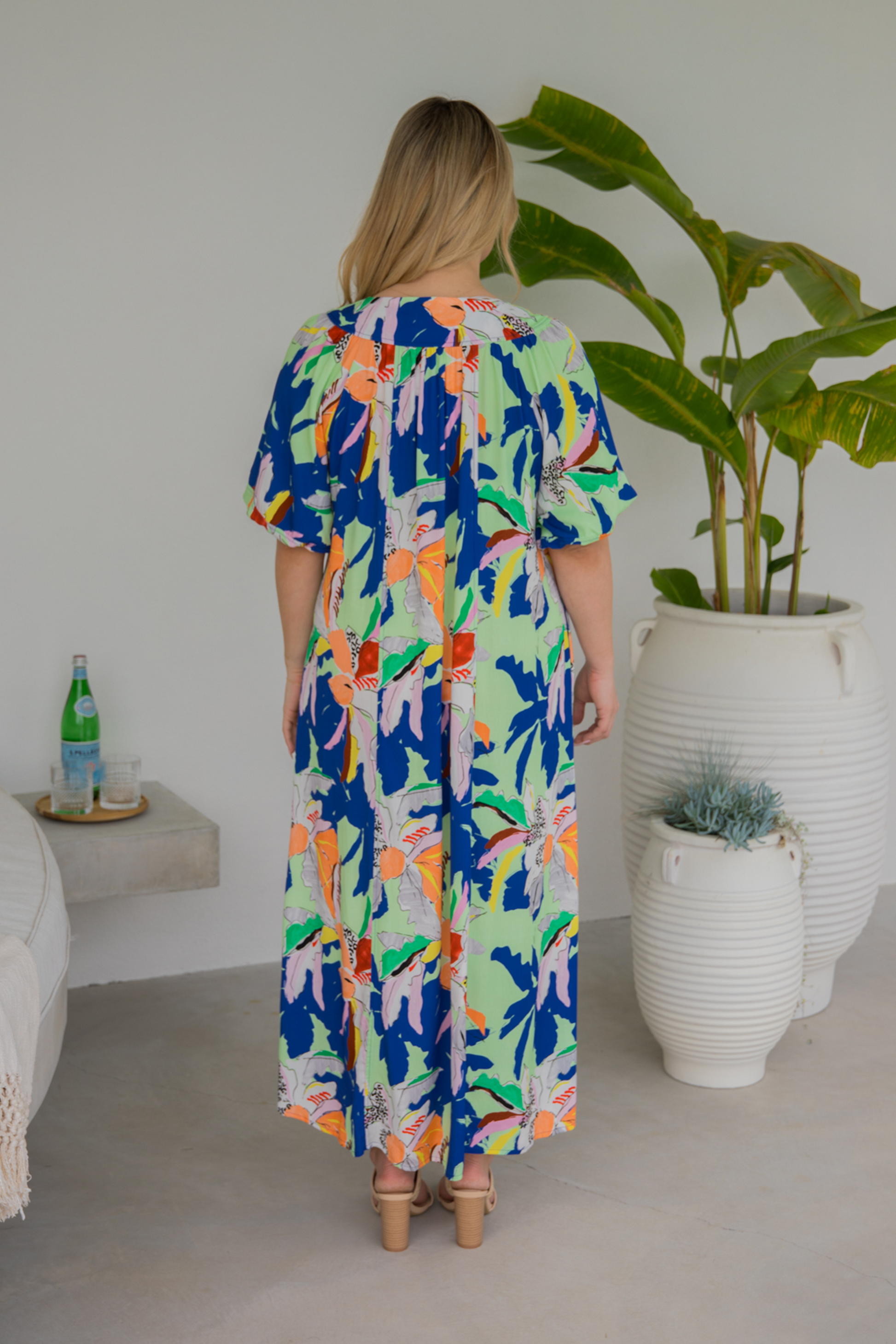 The Novella Dress features a V-neckline and is crafted from lightweight, breathable 100% rayon. It includes a hidden drawstring for an optional, flattering fit and elbow-length puff sleeves with elasticated cuffs. Designed with a maxi length and two side in-seam pockets, this dress offers both comfort and versatility.