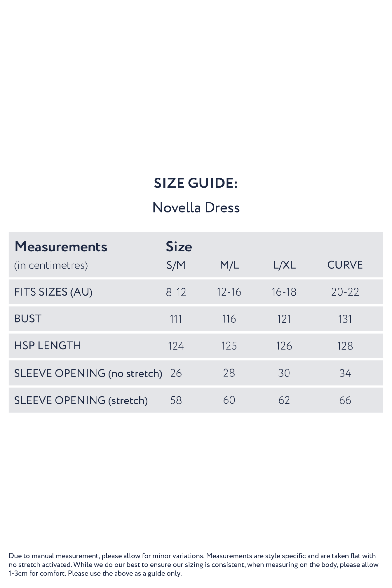 • We recommend choosing your size for the Novella Dress based on the bust measurements for your body