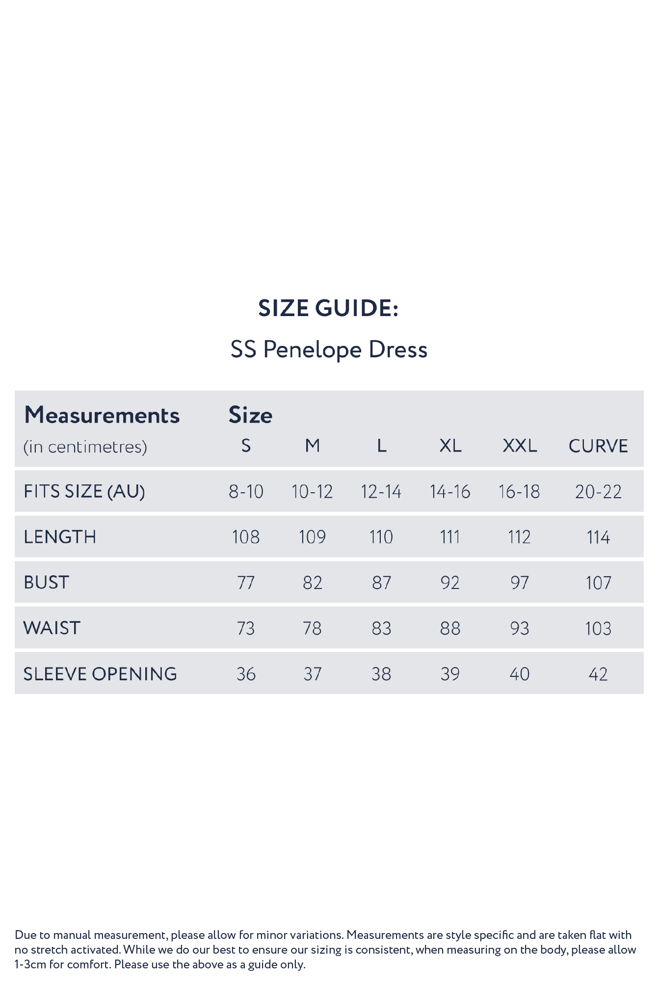 • We recommend choosing your size for the Short Sleeve Penelope Dress based on the bust and waist measurements for your body