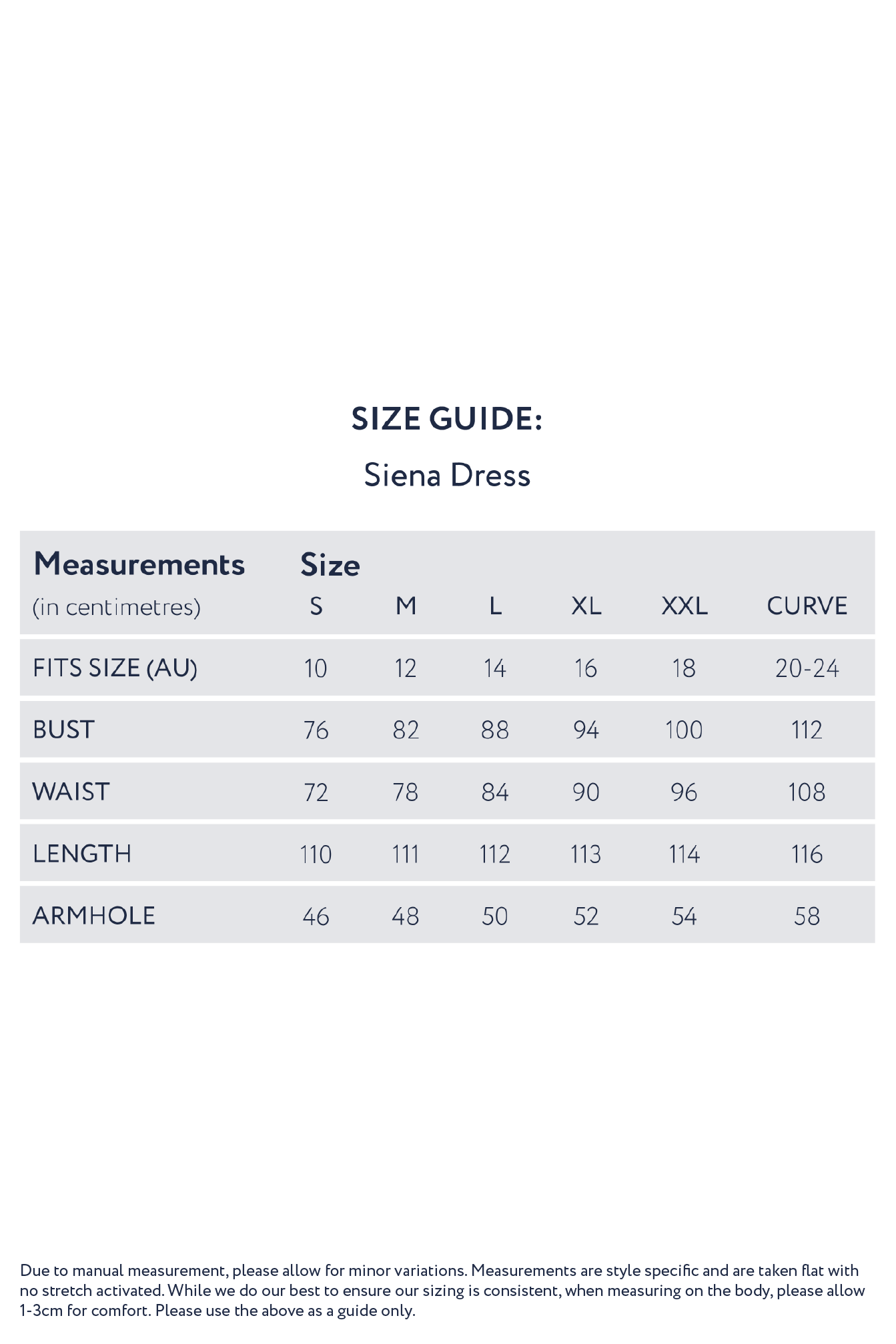 Because each silhouette is unique, sizing may vary from style to style. Please refer to the product description for specific garment measurements. Our size recommendations are based on Australian sizing, and wherever possible, we include bust, length, and sleeve opening measurements to help you find your perfect fit.