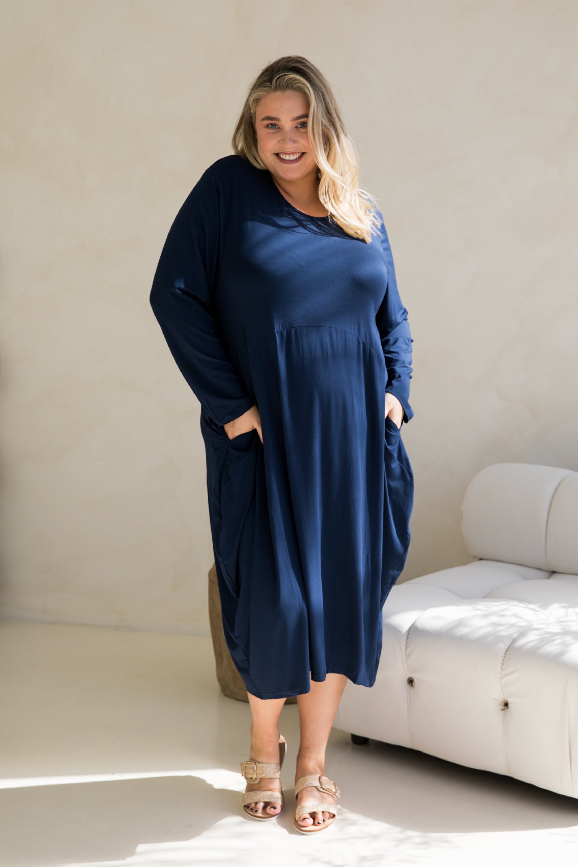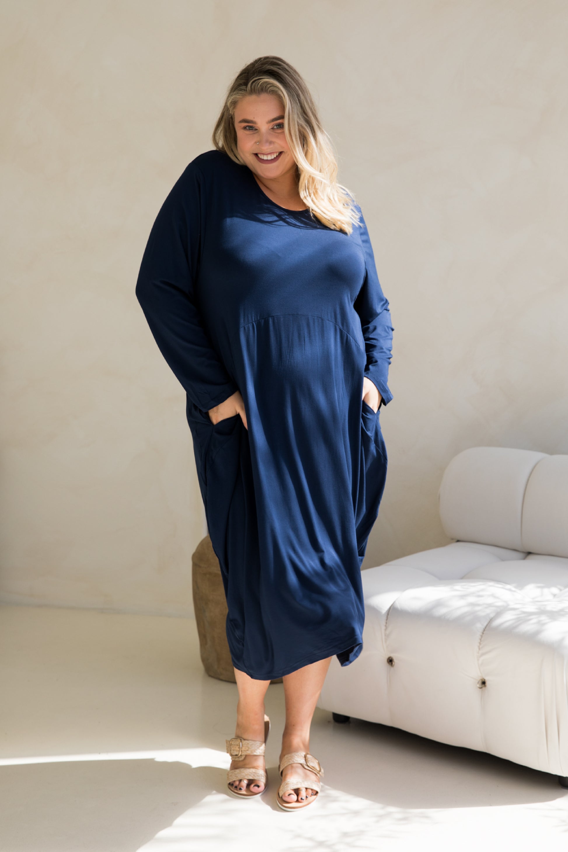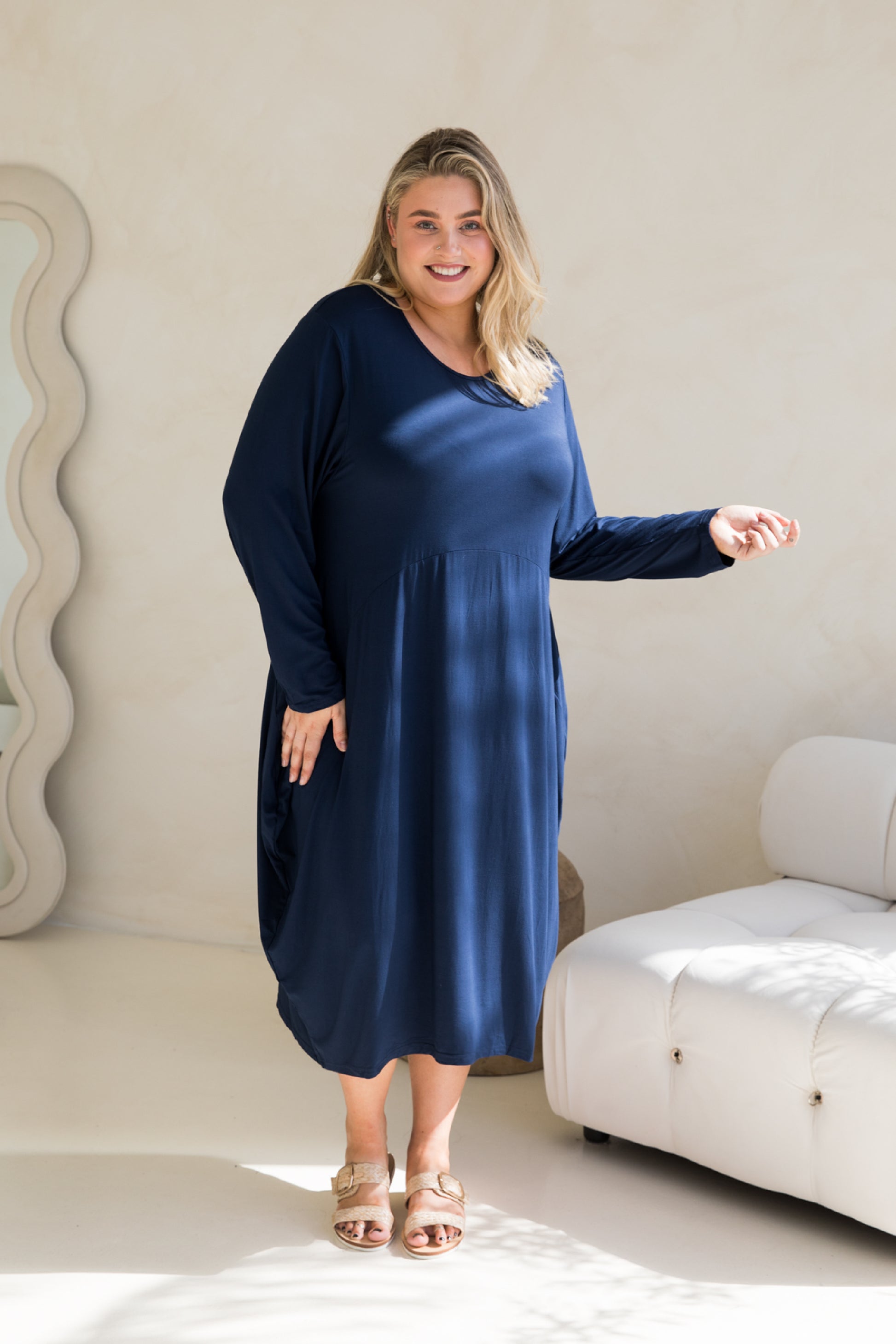 Comfort is key in the Soho Dress, making it an incredibly easy everyday style. Created in a deep Navy blue bamboo fabric, this piece features a curved empire line panel, full length sleeves, a round neck and an oversized skirt silhouette.